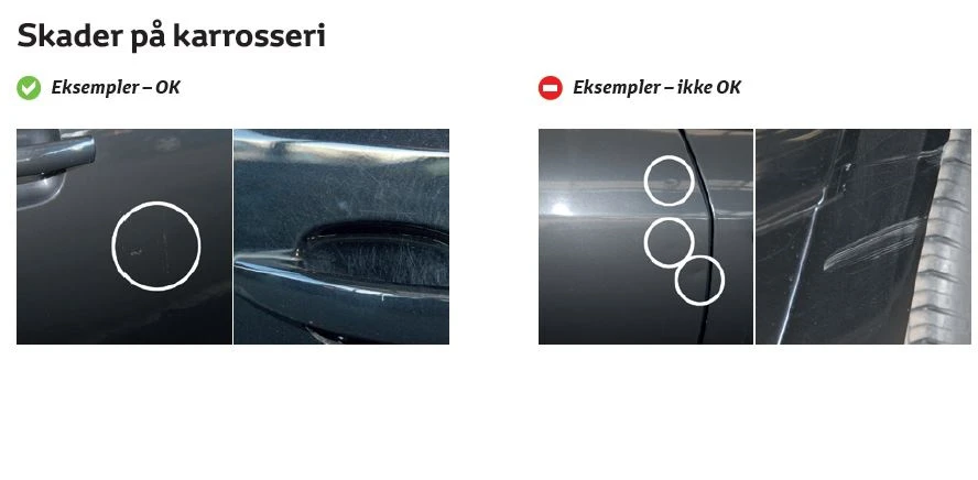 - Mindre skrammer eller tryk i gummilister, der ikke skæmmer eller gør bilen mindre solid.