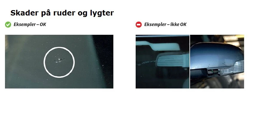 - Isolerede stenslag eller afstødte splinter dog ikke større end 5 mm - og uden for førerens synsfelt