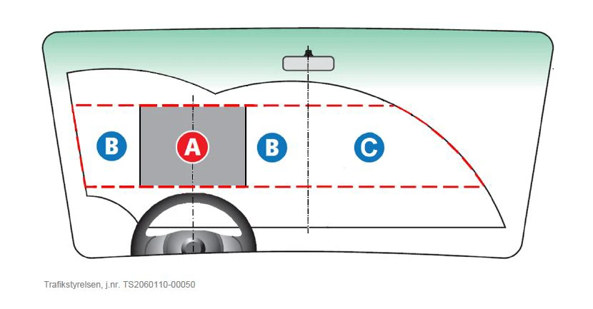 For biler med centerplaceret rat vil forruden kun bestå af område A og område B.